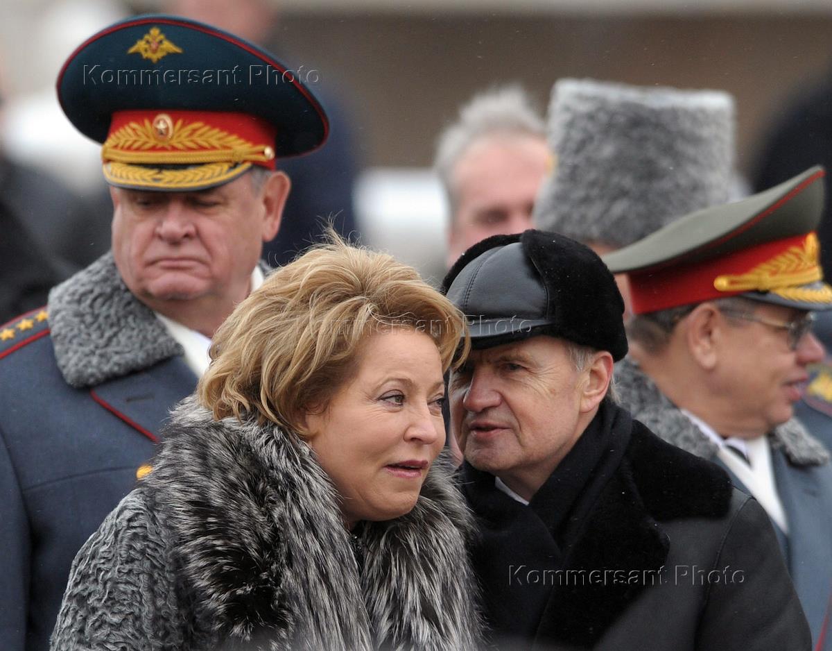 День защитника Отечества. Председатель Совета Федерации России Валентина Матвиенко (слева) и председатель Конституционного суда России Валерий Зорькин (справа) на церемонии возложения цветов к Могиле Неизвестного Солдата.