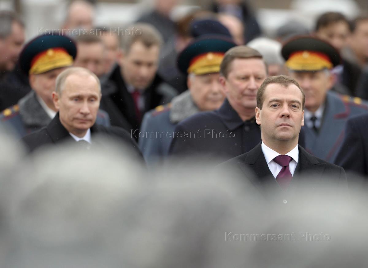 День защитника Отечества. Президент России Дмитрий Медведев (слева) и председатель правительства России Владимир Путин (справа) на церемонии возложения цветов к Могиле Неизвестного Солдата.