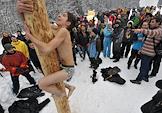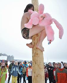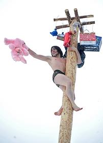 Празднование "Бакшевской масленицы". Участник праздника на шесте с розовым игрушечным зайцем.