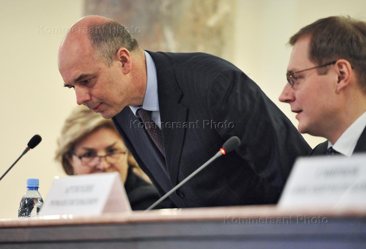 Министр финансов России Антон Силуанов (слева) и директор Департамента информационных тенологий и связи Правительства России Алексей Попов (справа) во время расширенного заседания коллегии Министерства финансов России.
