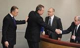 Слева направо: руководитель московского отделения партии "Патриоты России" Сергей Глотов, лидер "Правого дела" Андрей Дунаев и председатель "Яблока" Сергей Митрохин, член комитета ГД по жилищной политике и жилищно-коммунальному хозяйству Николай Валуев на пленарном заседании Государственной думы России.