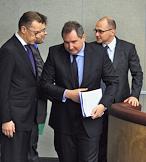 Слева направо: полномочный представитель Правительства России в Государственной Думе России Андрей Логинов, заместитель председателя правительства России Дмитрий Рогозин и глава Федерального агентства по атомной энергии (Росатом) Сергей Кириенко во время заседания Государственной думы.