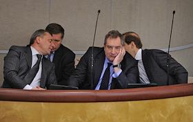Заместитель министра промышленности и торговли России Юрий Борисов (слева), заместитель председателя правительства России Дмитрий Рогозин (в центре), заместитель министра промышленности и торговли России Денис Мантуров (второй справа), член счетной комиссии ГД, член комитета ГД по федеративному устройству и вопросам местного самоуправления Анатолий Локоть во время заседания Государственной думы.