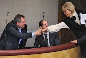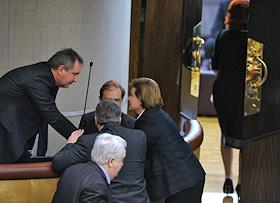 Вице-премьер России Дмитрий Рогозин (слева), заместитель министра промышленности и торговли России Денис Мантуров (второй справа), первый заместитель председателя комитета Государственной думы России по охране здоровья Татьяна Яковлева (справа) во время заседания Государственной думы.