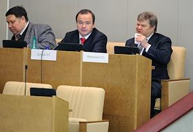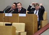 Слева направо: руководитель московского отделения партии "Патриоты России" Сергей Глотов, лидер "Правого дела" Андрей Дунаев и председатель "Яблока" Сергей Митрохин на пленарном заседании Государственной думы России.