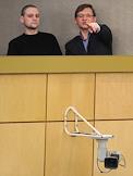 Слева направо: лидер "Правого дела" Андрей Дунаев и председатель "Яблока" Сергей Митрохин на экране монитора пленарного заседания Государственной думы России.