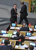 Заместитель министра промышленности и торговли России Денис Мантуров (cлева) и председатель комитета Государственной думы по международным делам Алексей Пушков (справа) на заседании Госдумы.
