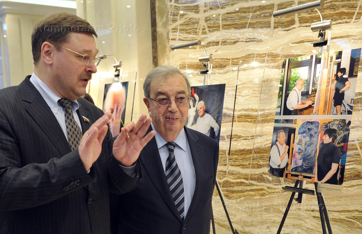 Первый заместитель председателя комитета Государственной думы (ГД) России по международным делам Константин Косачев (слева) и председатель совета директоров федерального сетевого оператора в сфере навигационной деятельности "НИС ГЛОНАСС" Евгений Примаков (справа) на церемония открытия выставки фотокорреспондента Эдуарда Песова "Кадры" в Зимнем саду Клубного корпуса отеля Crowne Plaza Moscow WTC.