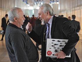 Председатель комитета Государственной думы России по культуре Станислав Говорухин (слева) и художник Александр Шилов (справа) во время встречи председателя правительства России Владимира Путина с представителями Общероссийского народного фронта (ОНФ), региональных штабов, журналистами и политологами.