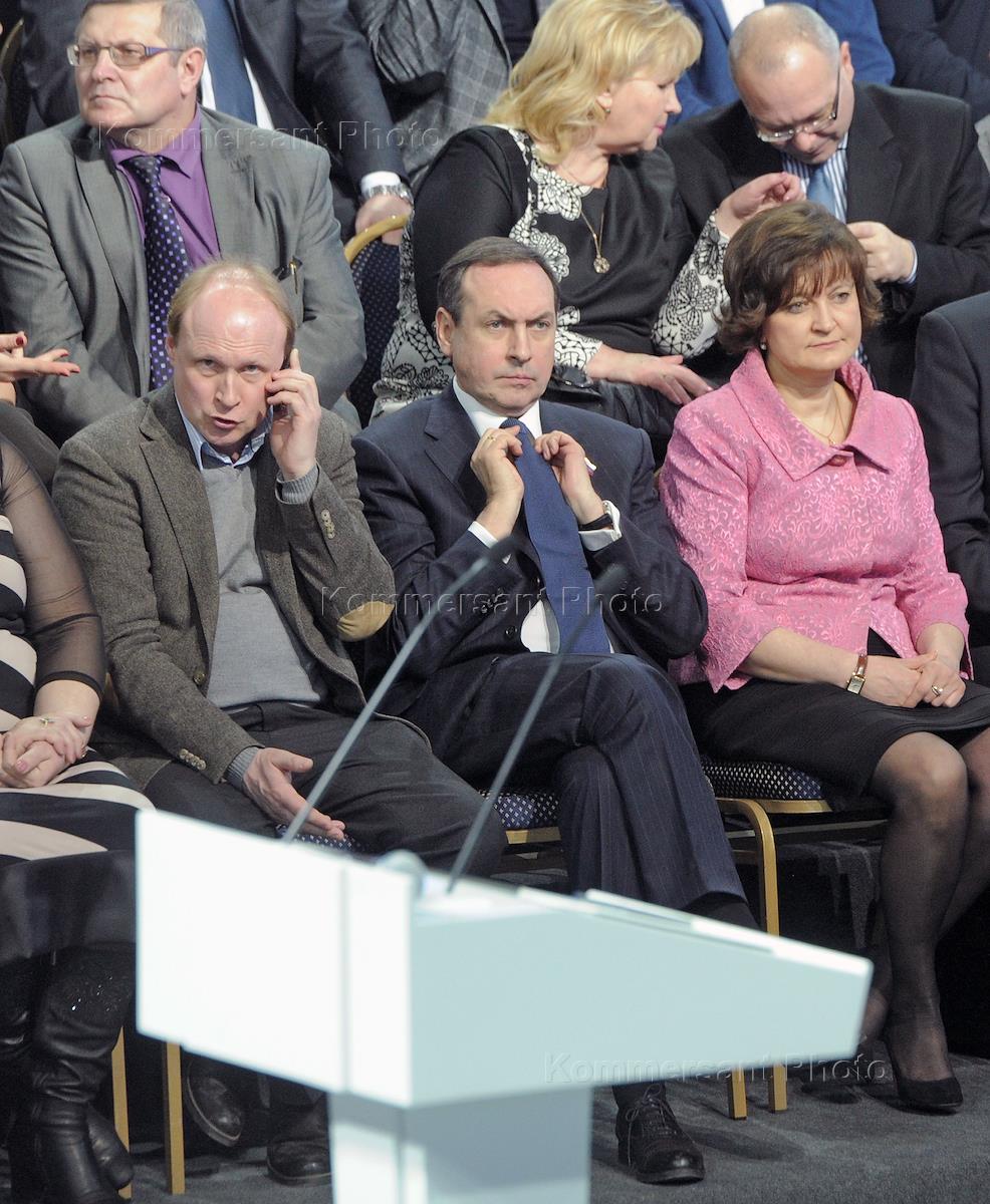 директор музея-усадьбы писателя Льва Толстого "Ясная Поляна" Владимир Толстой (слева) и xлен комитета Государственной думы России по бюджету и налогам Вячеслав Никонов (в центре) во время встречи председателя правительства России Владимира Путина с представителями Общероссийского народного фронта (ОНФ), региональных штабов, журналистами и политологами.