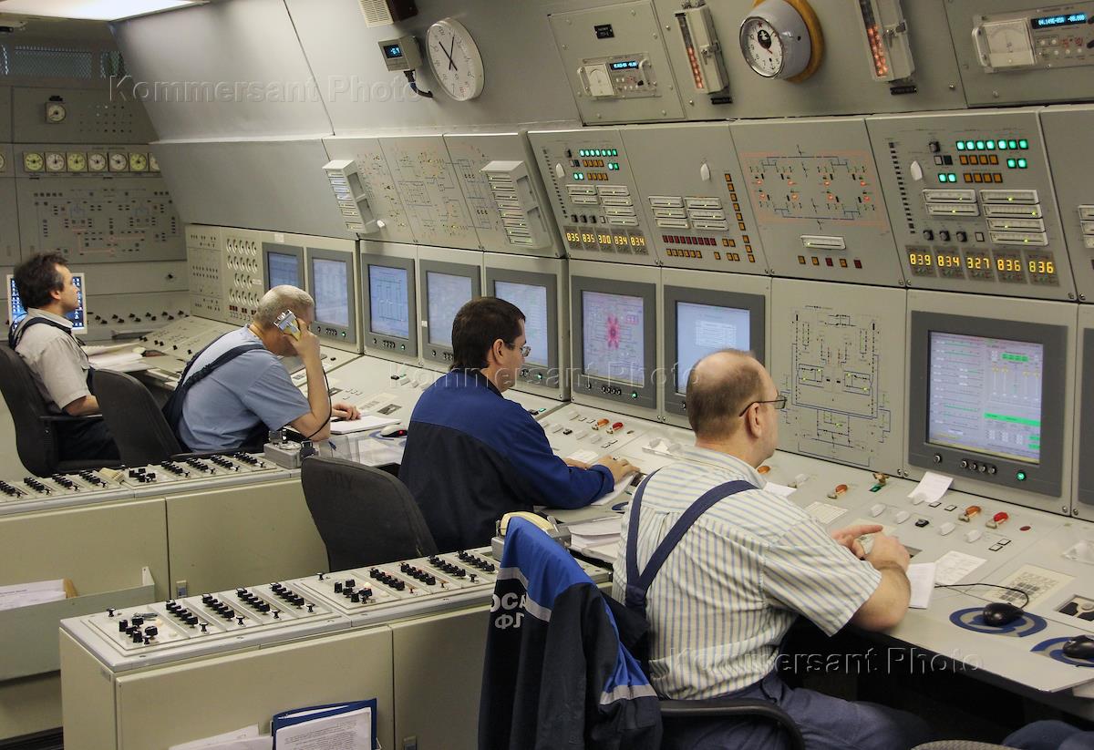 Дежурная смена на центральном пульте управления энергетической установки (ЦПУ) атомного ледокола "50 лет Победы".