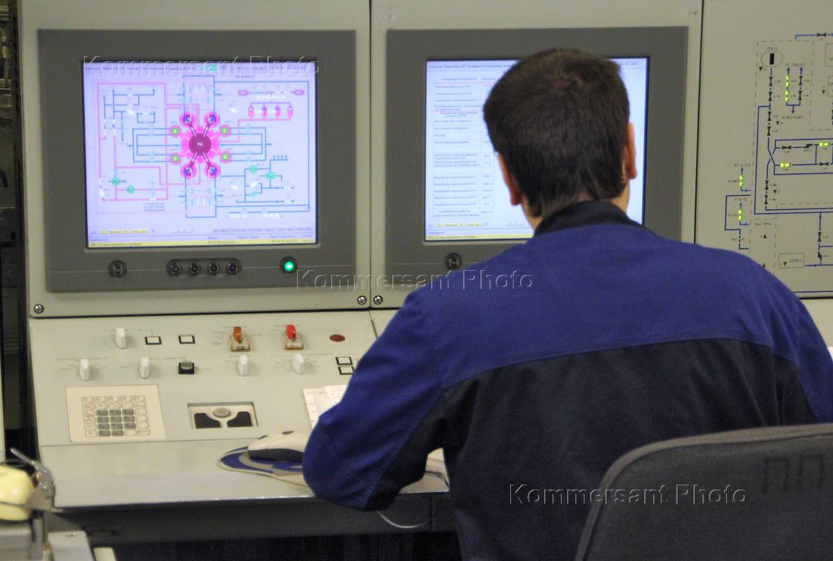 Дежурная смена на центральном пульте управления энергетической установки (ЦПУ) атомного ледокола "50 лет Победы".