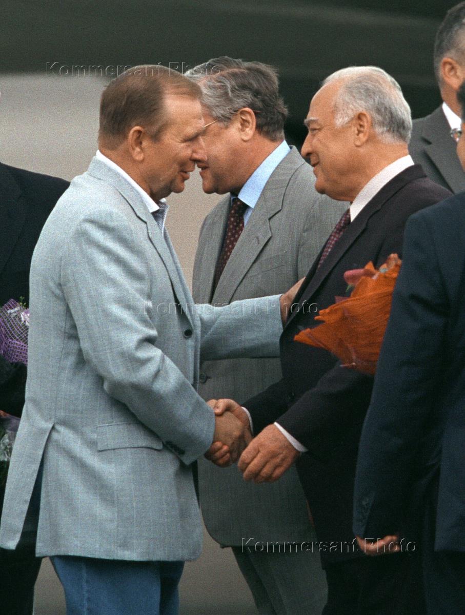 Ukrainian President Leonid Kuzhma (left) is greeted in the Moscow Vnukovo-2 airport by the Russian Plenipotentiary Ambassador to Ukraine Victor Chernomyrdin.