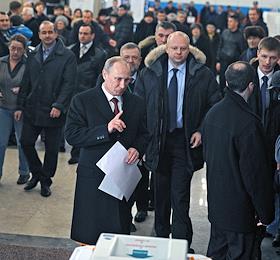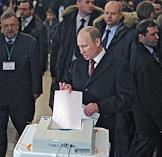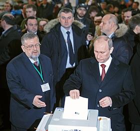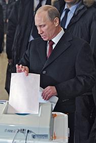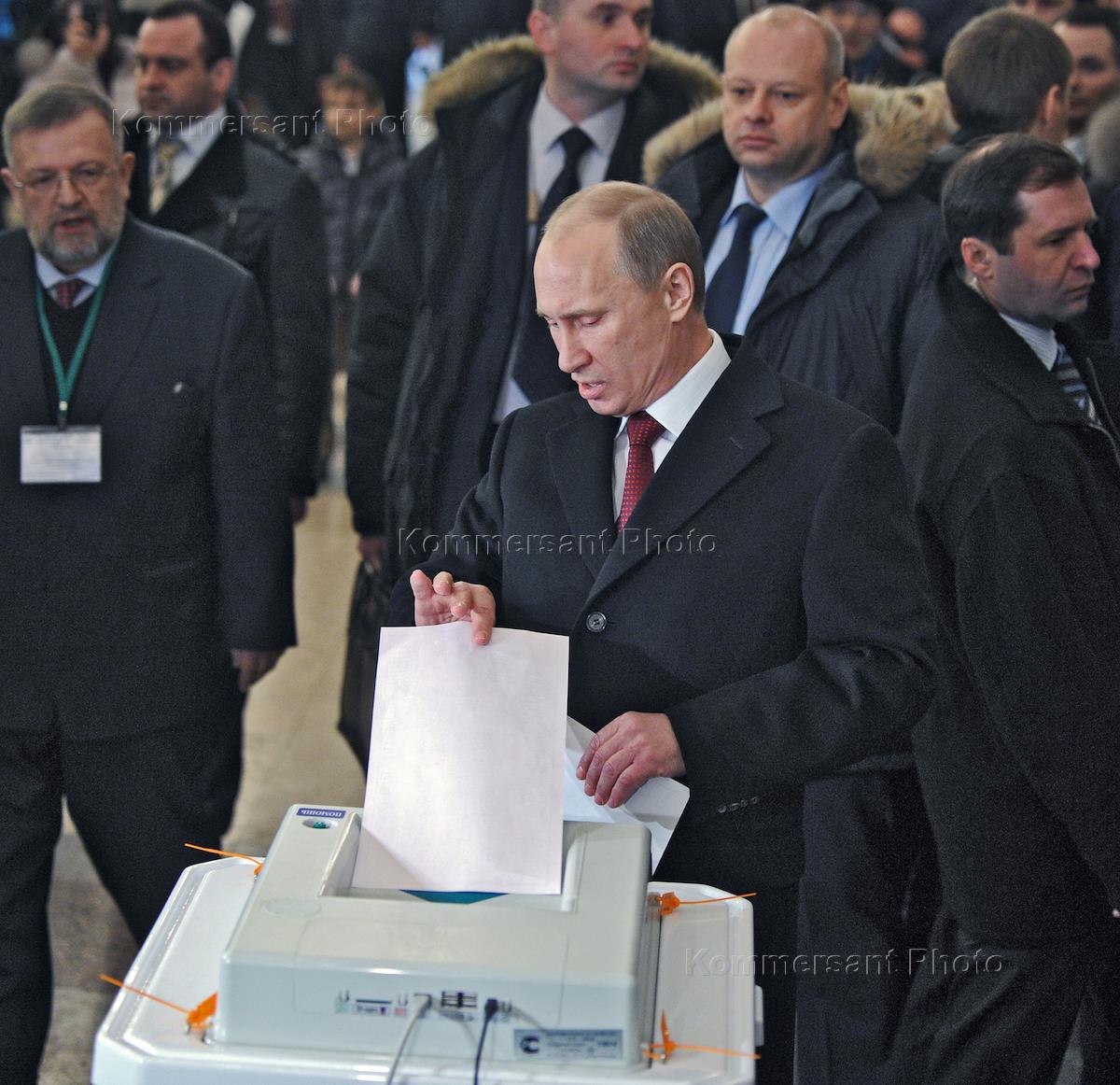 Выборы президента России. Кандидат на должность президента России, председатель правительства России Владимир Путин во время голосования на избирательном участке.