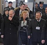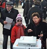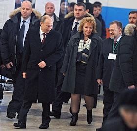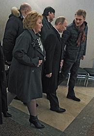 Выборы президента России. Кандидат на должность президента России, председатель правительства России Владимир Путин (в центре) с супругой Людмилой Путиной (справа) во время голосования на избирательном участке.
