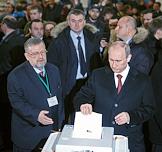 Выборы президента России. Кандидат на должность президента России, председатель правительства России Владимир Путин (справа) и заместитель директора Института этнологии и антропологии РАН, председатель участковой избирательной комиссии Владимир Зорин (слева) во время голосования на избирательном участке.