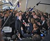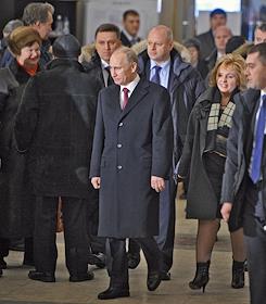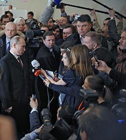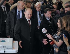 Выборы президента России. Кандидат на должность президента России, председатель правительства России Владимир Путин (в центре) отвечает на вопросы журналистов после голосования на избирательном участке.