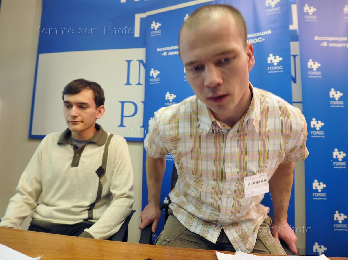Выборы президента России. Наблюдатели на выборах от штаба Михаила Прохорова Антон Иващенко и Ильдар Дадин на пресс-конференции в Независимом пресс-центре.