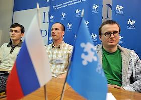 Выборы президента России. Слева направо: наблюдатели на выборах от штаба Михаила Прохорова Антон Иващенко, Ильдар Дадин и наблюдатель на выборах от ассоциации "Голос" Данила Сухарев на пресс-конференции в Независимом пресс-центре.