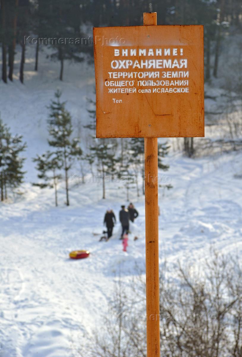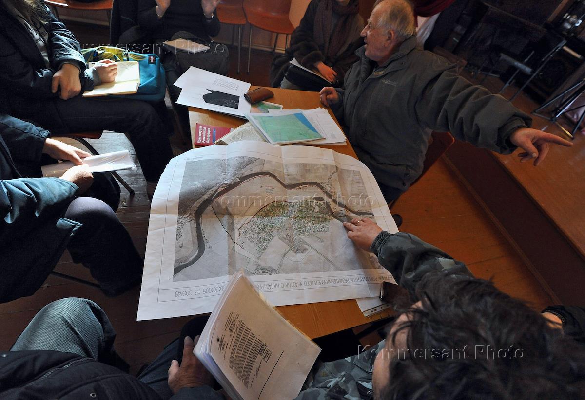 Староста села Иславское Борис Барыкин (слева), жители поселка Уборы Кирилл Суворов (второй справа) и Валерий Пьянов (справа) во время обсуждения кадастрового плана села Иславское.