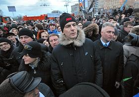 Кандидат на должность президента России, президент "Онэксим" Михаил Прохоров (в центре) во время проведения митинга "За честные выборы". Митинг прошел на Пушкинской площади.