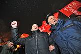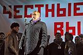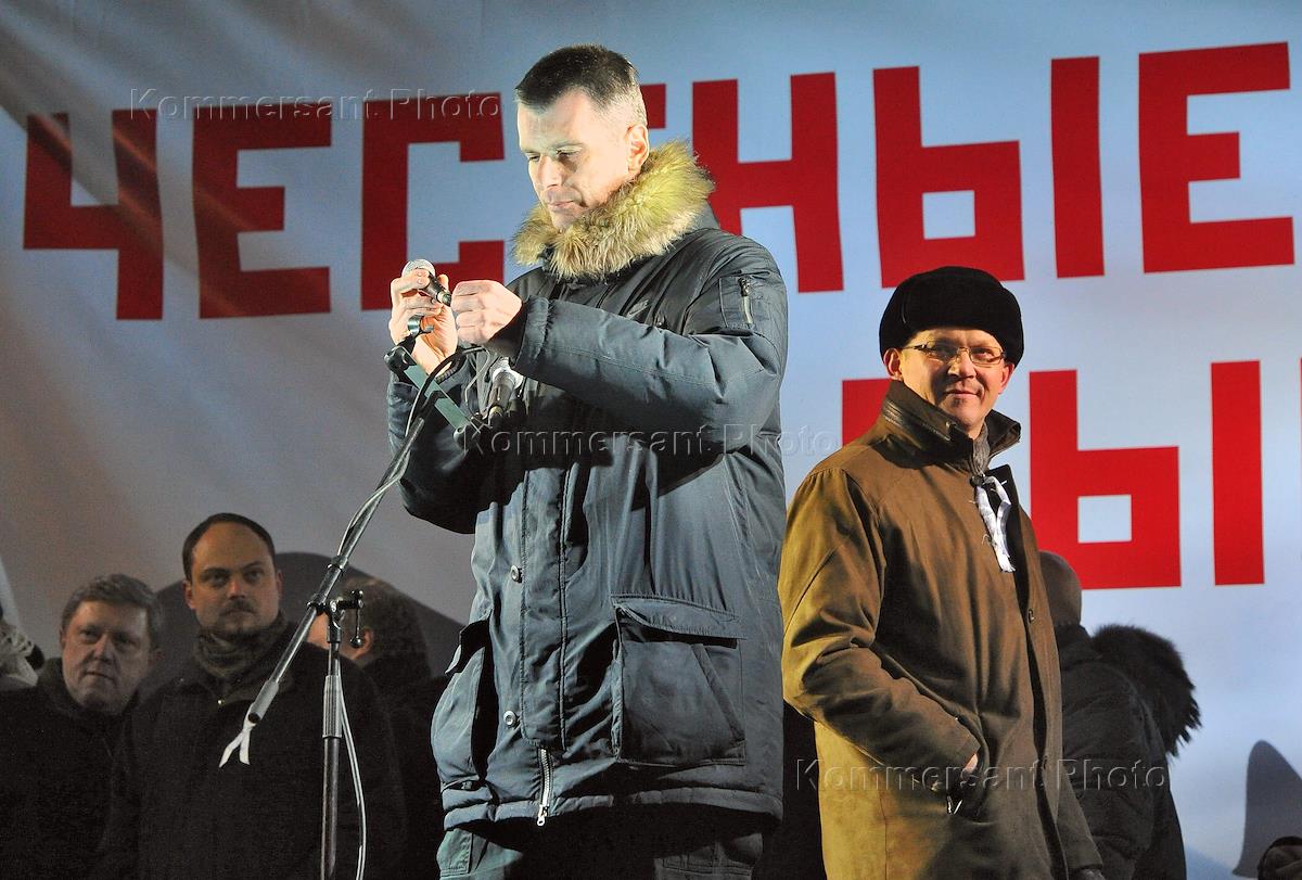 Кандидат на должность президента России, президент "Онэксим" Михаил Прохоров (в центре) и сопредседатель оппозиционной Партии народной свободы (ПАРНАС) Владимир Рыжков (справа) во время проведения митинга "За честные выборы". Митинг, посвященный итогам выборов президента России, прошел на Пушкинской площади.