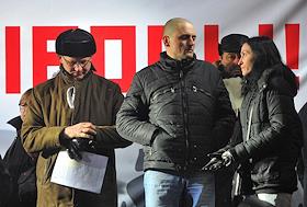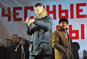 Лидер движения "Левый фронт" Сергей Удальцов (второй слева) и лидер фракции "Яблоко" в Законодательном собрании Санкт-Петербурга Григорий Явлинский (справа) во время проведения митинга "За честные выборы". Митинг, посвященный итогам выборов президента России, прошел на Пушкинской площади.