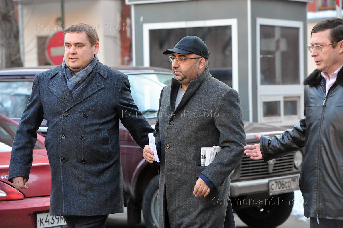 Deputy Chairman of the Vnesheconombank Anatoly Ballo (second right) accused of fraud after the hearing in the Tverskoy court.