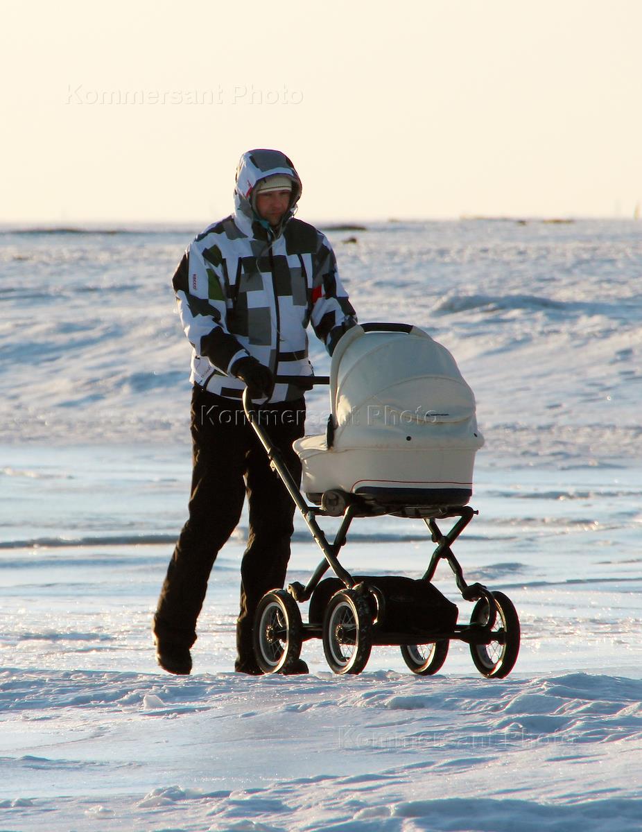 Жанровая фотография. Человек с детской коляской на люду Финского залива.