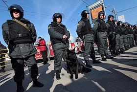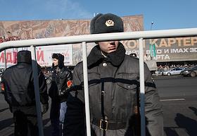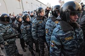 Сотрудники ОМОНа на митинге "За честные выборы", организованном активистами движения "Левый фронт" на Новом Арбате.