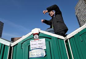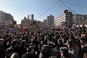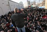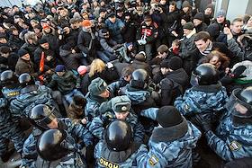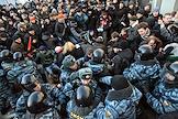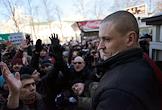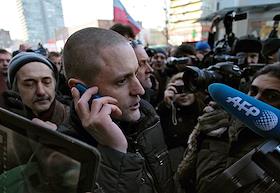 Лидер движения "Левый фронт" Сергей Удальцов (справа) во время задержания сотрудниками правоохранительных органов на митинге "За честные выборы", организованном активистами движения "Левый фронт" на Новом Арбате.
