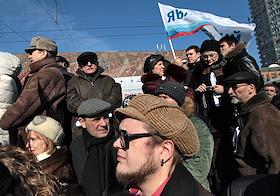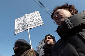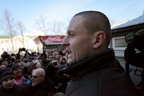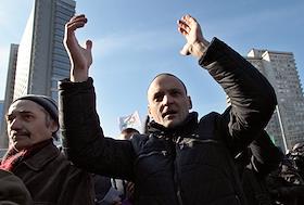 Лидер движения "Левый фронт" Сергей Удальцов (справа) во время митинга "За честные выборы", организованном активистами движения "Левый фронт" на Новом Арбате.