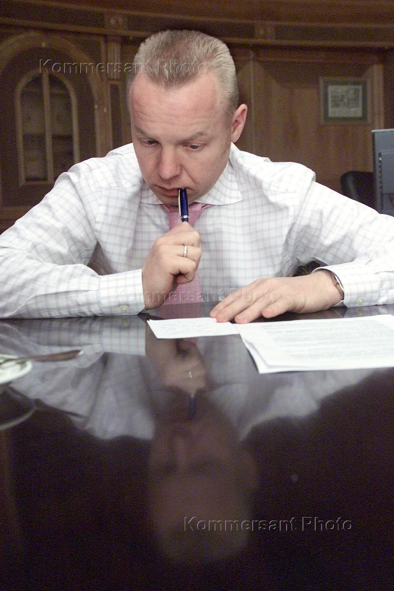 Президент компании "СИБУР" Дмитрий Мазепин отвечает на вопросы журналистов в своем рабочем кабинете.