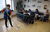 Холл экономического факультета Высшей школы экономики. Уборщица во время работы.