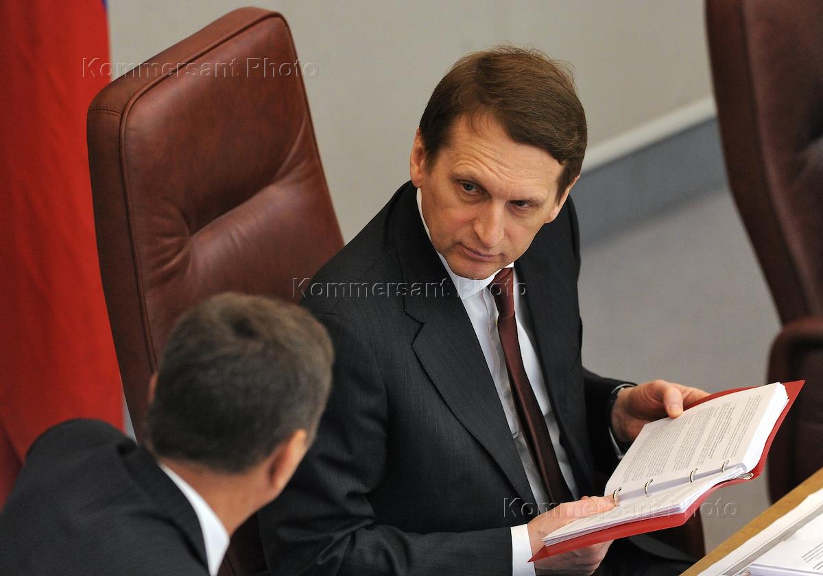 Председатель Государственной думы (ГД) России Сергей Нарышкин (справа) на пленарном заседании Госдумы.