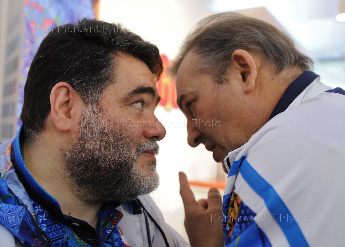 Председатель наблюдательного совета компании Bosco di Ciliegi Михаил Куснирович (слева) и член комитета Государственной думы России по физической культуре, спорту и делам молодежи Владислав Третьяк (справа) во время презентации лицензионной весенне-летней коллекции "Сочи-2014", представленной компанией Bosco. Презентация прошла в Главном универсальном магазине (ГУМ).