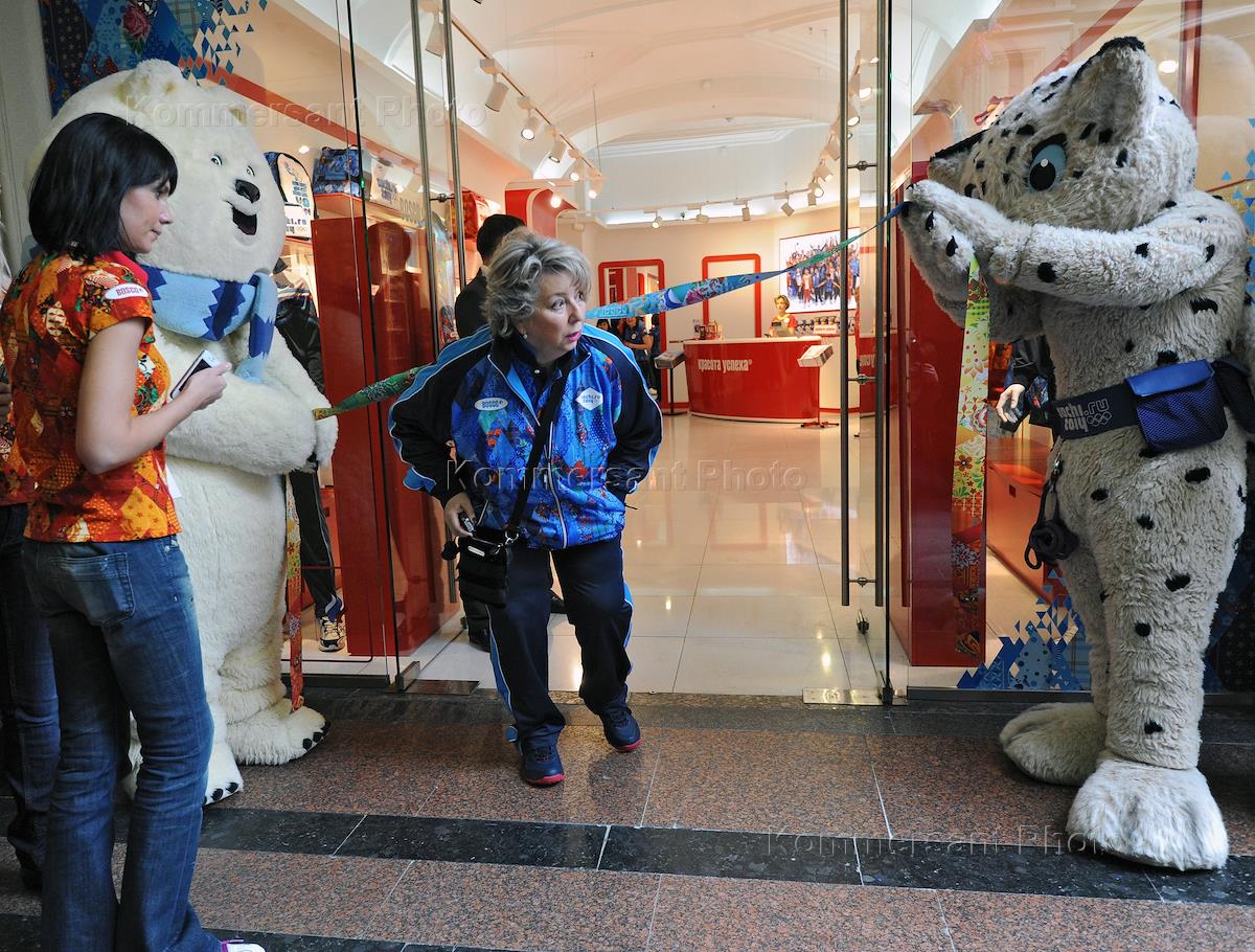 Тренер по фигурному катанию Татьяна Тарасова во время презентации лицензионной весенне-летней коллекции "Сочи-2014", представленной компанией Bosco. Презентация прошла в Главном универсальном магазине (ГУМ).