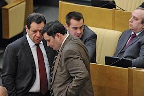 Заместитель председателя комитета Государственной думы России по бюджету и налогам Геннадий Кулик (справа) во время думского заседания.