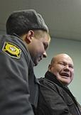 Националист Вячеслав Дацик (справа), обвиняемый в разбое и поджоге церкви, во время заседания Невского районного суда.