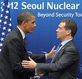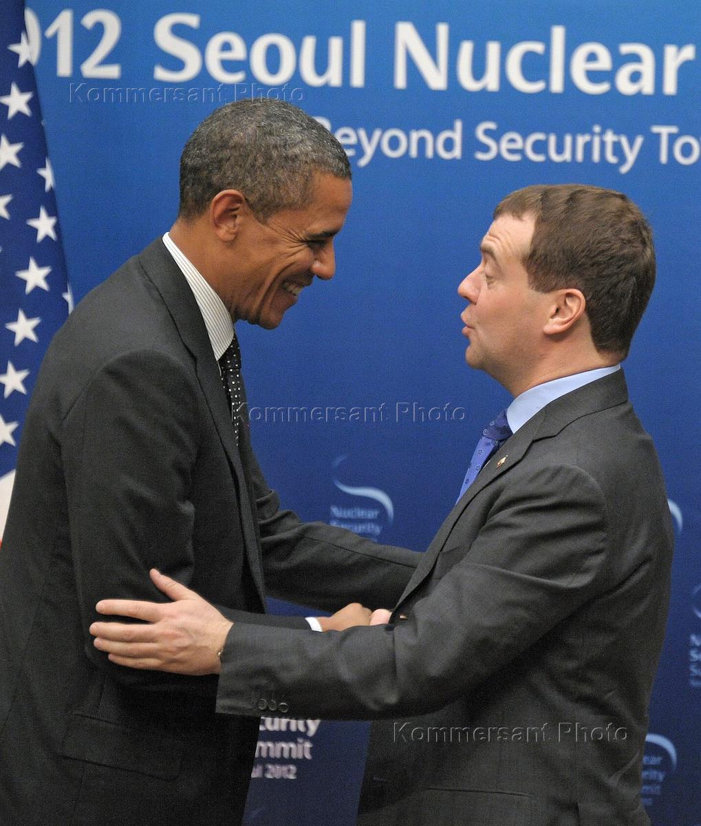Президент США Барак Обама (слева) и президент России Дмитрий Медведев (справа) во время встречи на саммите по ядерной безопасности.