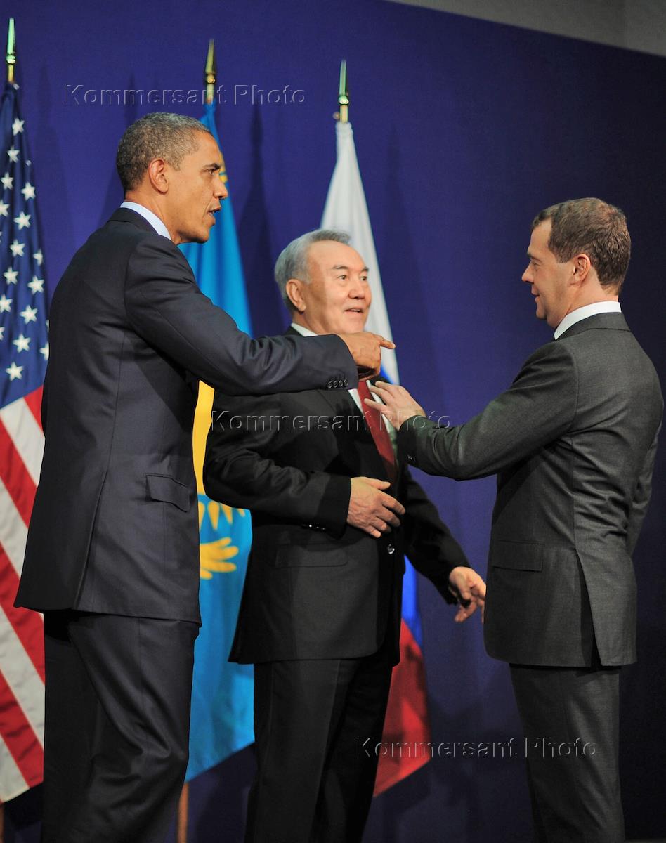 Слева направо: президент США Барак Обама, президент Казахстана Нурсултан Назарбаев и президент России Дмитрий Медведев во время встречи на саммите по ядерной безопасности.
