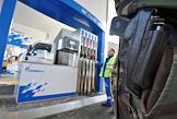 Автозаправочная станция "Газпромнефть" №150. Сотрудник автозаправки заливает бензин в бензопак машины.