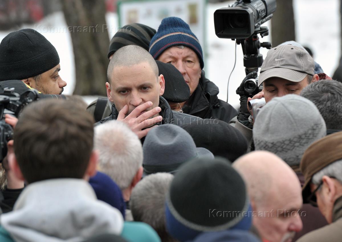 Лидер движения "Левый фронт" Сергей Удальцов (в центре) во время проведения Акции оппозиции "За честные выборы" в формате встречи с гражданами. Акция прошла на Пушкинской площади.