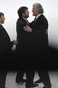 Континентальная хоккейная лига (КХЛ). Главный тренер команды "Динамо" Олег Знарок (в центре) и главный тренер команды СКА Милош Ржига (справа) после матча между командами "Динамо" (Москва) - СКА (Санкт-Петербург). Матч прошел на малой спортивной арене "Лужники".