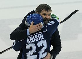 Континентальная хоккейная лига (КХЛ). Хоккеист Михаил Анисин (слева) и главный тренер команды СКА Милош Ржига (в центре) после матча между командами "Динамо" (Москва) - СКА (Санкт-Петербург). Матч прошел на малой спортивной арене "Лужники".