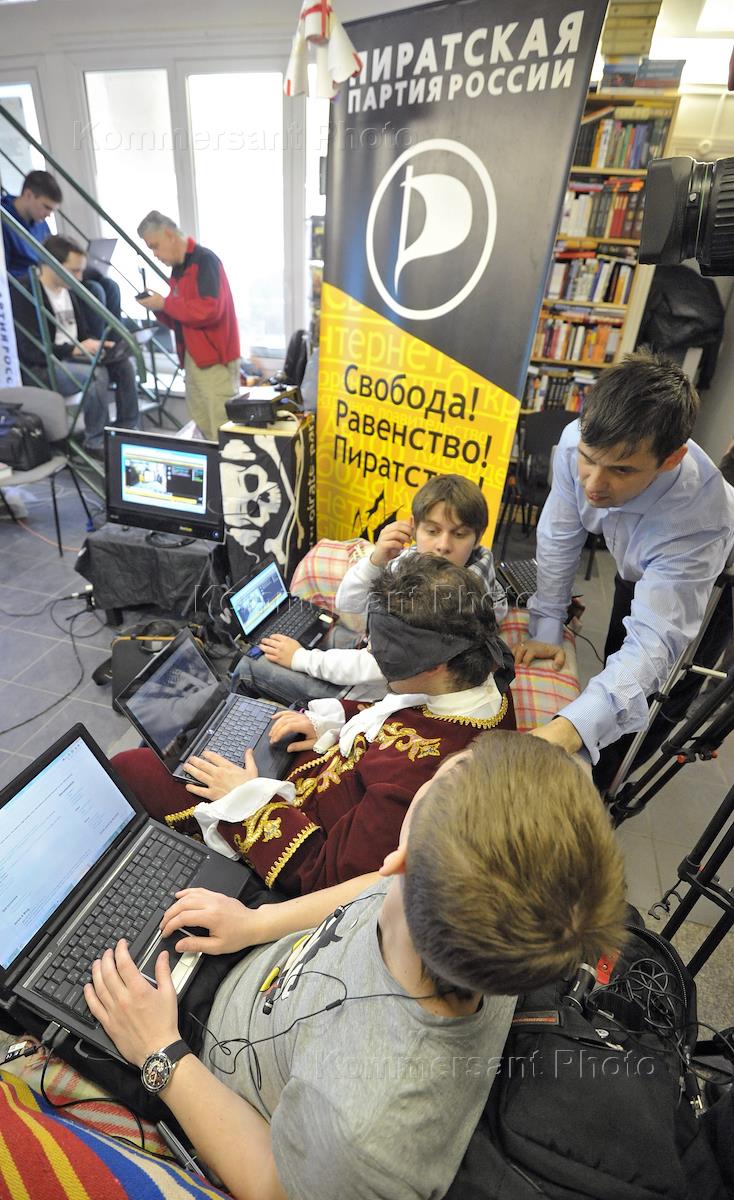 Председатель "Пираццкой партии России" Павел Рассудов (справа) на съезде сторонников незарегистрированной Пиратской партии в книжном магазине "Циолковский".