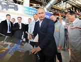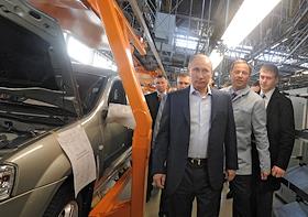Председатель правительства России Владимир Путин (слева) и президент ОАО "АвтоВАЗ" Игорь Комаров (второй справа) на церемонии запуска серийного производства автомобиля "Лада-Ларгус" на "АвтоВАЗе".