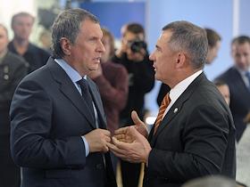 Заместитель председателя правительства России Игорь Сечин (слева) и президент республики Татарстан Рустам Минниханов (справа) перед началом совещания на тему: "О развитии автомобильной отрасли в условиях вступления России в ВТО". Совещание прошло на АвтоВАЗе.