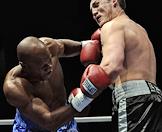 Боксерское шоу "Звездный ринг". Боксер из Барбадоса Шон Кокс (слева) и российский боксер Денис Лебедев (справа) во время боя за титул чемпиона мира по версии WBA. Шоу состоялось в Crocus City Hall.