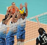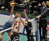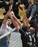 Чемпионат России по волейболу. Игрок команды "Динамо" Петер Вереш (слева) во время матча между командами "Динамо" (Москва) - "Искра" (Одинцово) в УСК "Дружба".